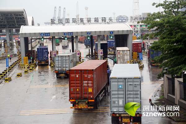 货柜车在盐田国际集装箱码头B闸口有序进港