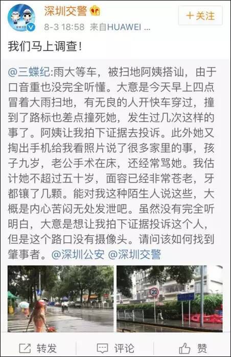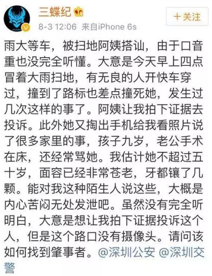 8月3日,网友“@三蝶纪”微博发文并@深圳交警,称帮一位环卫阿姨投诉,一司机撞倒隔离桩逃逸,还差点撞到这位环卫阿姨。该网友还称,环卫阿姨希望该网友拍下证据投诉这辆逃逸的士。