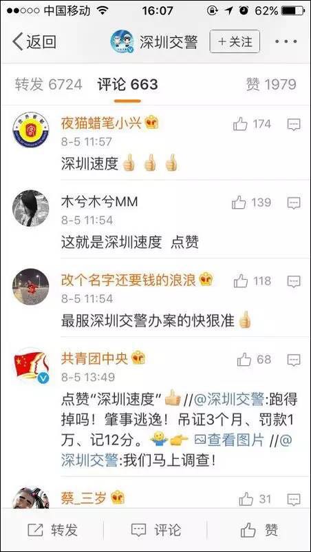 深圳交警通报此情况后,“共青团中央”“高德地图”“政务微博观察”等微博纷纷向深圳交警点赞。飞快的反应和破案速度,与网友细致耐心的交流,深圳交警这办事的效率、态度,也让网友大呼给力,纷纷表示:这才是特区速度!
