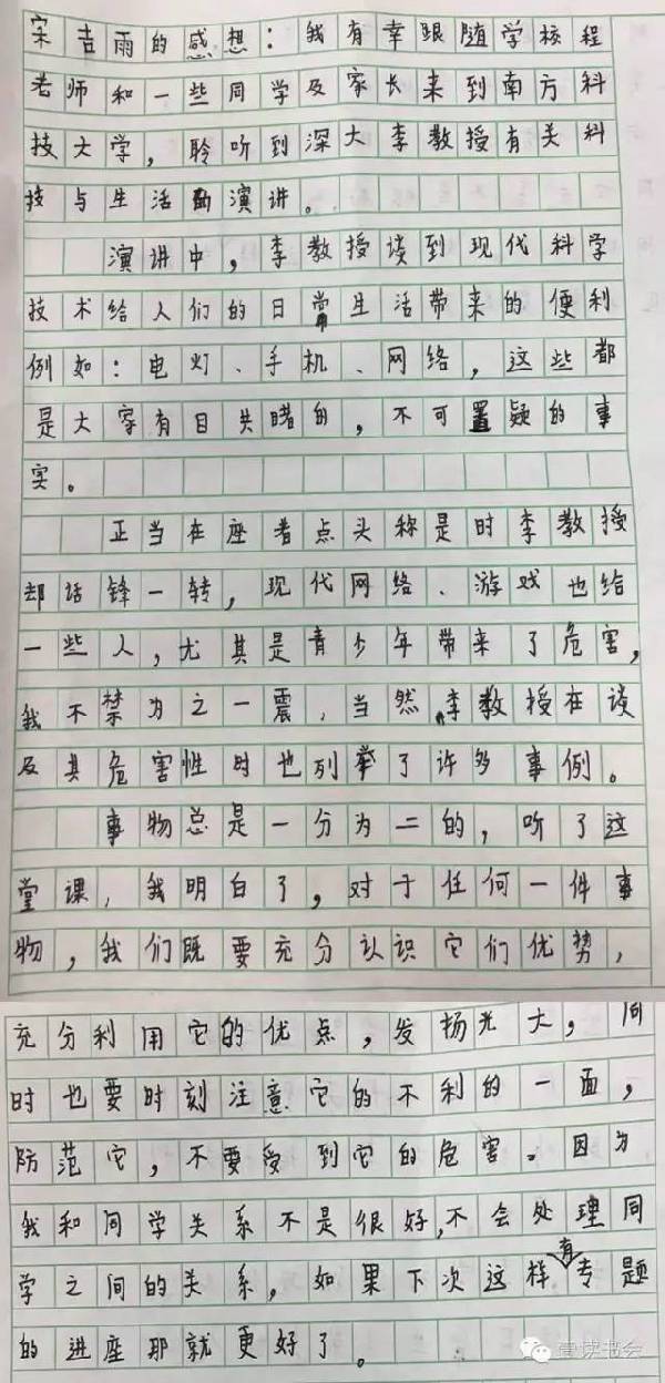 近日,多位小朋友特地就这次讲座表达感想。他们纷纷盛赞讲座深刻,令其受益匪浅,“深受感动”。他们纷纷在感想里提到李教授平易近人,讲课精彩,更在听完李教授的课后开始反思现代科技与当代生活,提升自身思想和文化水平。