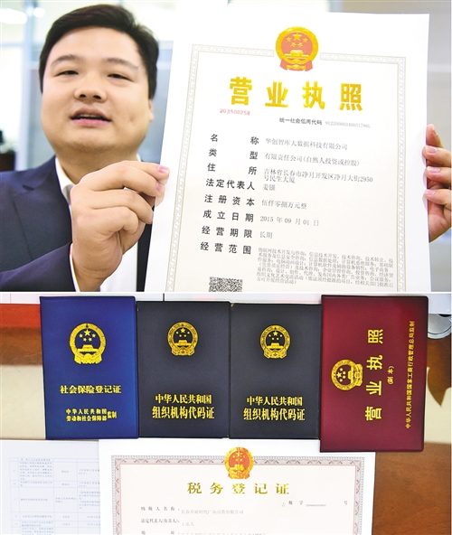 上图为经营业主展示吉林省首张“五证合一”营业执照。下图为商事改革前需办理的工商营业执照、组织机构代码、税务登记证、社保登记证和刻制公章准许证。