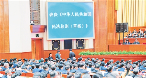 重点领域立法迈出新步伐,法律体系进一步完善。截至2017年9月,我国现行有效法律261件,行政法规751件,地方性法规10500余件。图为2017年3月15日,十二届全国人大五次会议表决民法总则草案。
