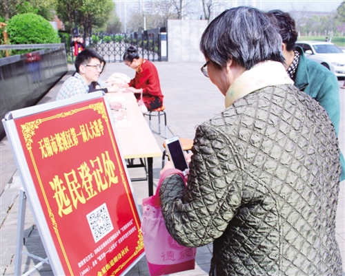 图为2016年4月,江苏省无锡市梁溪区金星街道朗诗社区居民通过手机微信“扫一扫”完成选民登记。