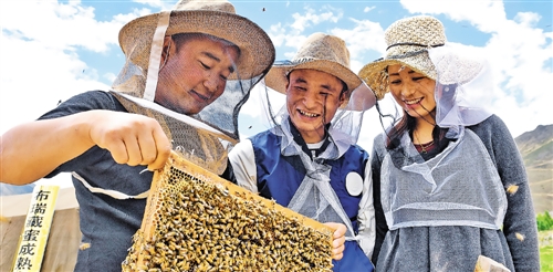 2015年8月,中央第六次西藏工作座谈会在北京召开。图为西藏自治区山南市门中村的尼吉蜜蜂养殖专业合作社社员们在蜂场里照看蜜蜂。