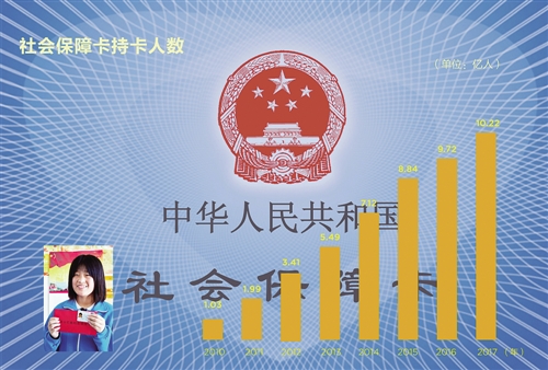 2017年7月,社会保障卡持卡人数已达到10.22亿,全国人力资源和社会保障领域102项社会保障卡应用目录平均开通率超过80%。