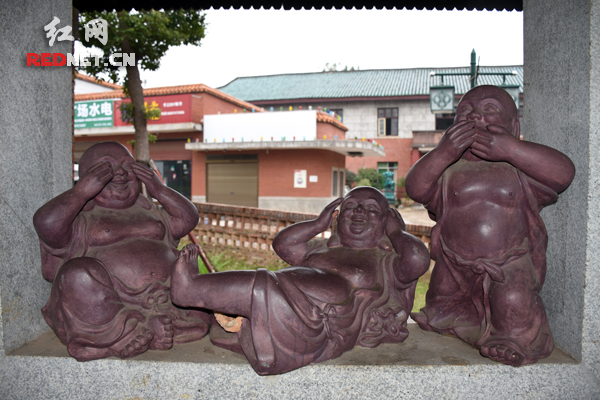 在铜官镇的窑火陶城文化广场的陶然亭内,陈列着陶艺大师谭异超的代表作弥勒佛《不看、不听、不说》,供游人们驻足欣赏。该作品曾获第七届“中华工艺优秀作品奖”。