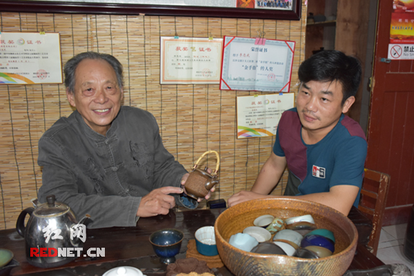 谭异超来到徒弟、“金手指”传人李忠武的工作室内喝茶,对仿古陶器的制作提出自己的想法和建议。