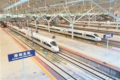 高铁成深圳市民跨城出行主要方式。图为深圳北站待发的列车。