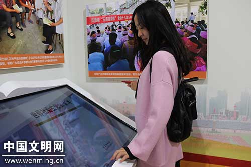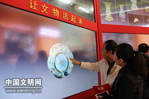 图为观众在触控屏幕上体验文物360度全视角展示。中国文明网原茵摄