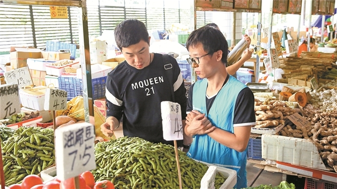 ▲本报记者李超(左)走访福田农批市场。 深圳晚报记者 陆颖摄