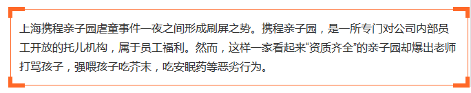 邓学平律师:我的观点还是倾向于认为携程也是受害方。毕竟携程的初衷是追求的提升员工幸福感,满足员工的具体需求才开办这个亲子园的。不过也需要查清楚一个事实:携程方面有没有具体参与亲子园的管理,他们跟第三方的合作形式到底是怎样的形式。就目前的信息来看,携程应该是将这项业务“打包”给第三方的,如果事实确实如此,携程并未参与具体的工作,那么它本身就是一个受害方。