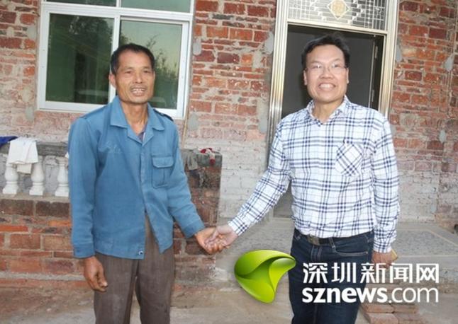 贫困户张建平(左)与深圳广电集团扶贫双坑村工作队队长曹伟强像老朋友一样握手。