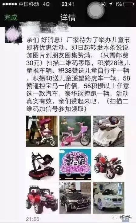邓女士看到自己的微信朋友圈有人在集赞,只要集够28个赞,就能得儿童推车,集够58个就能获得儿童豪华遥控跑车一辆。