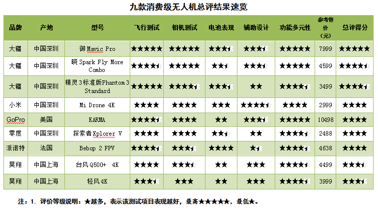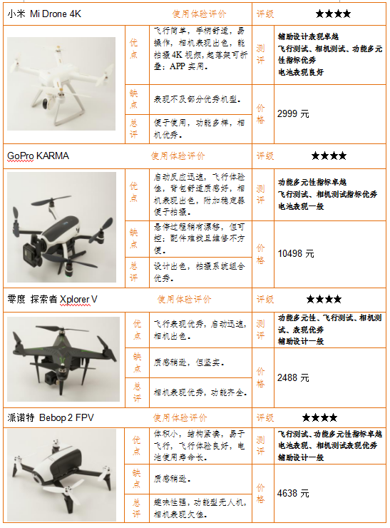 功能多元性:美国GoPro“KARMA”整体评分最佳。