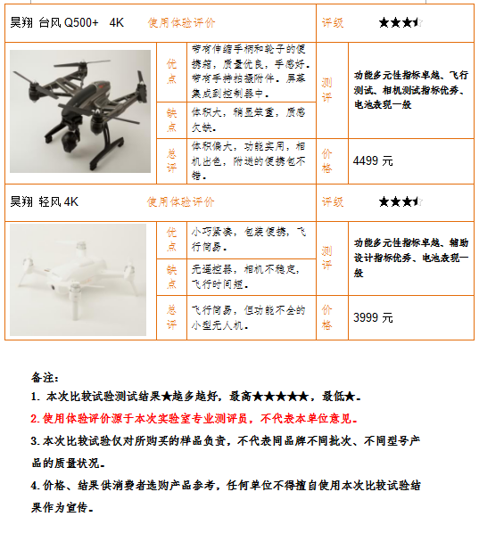 (二)单项指标优势明显。三款产品的飞行测试、相机测试、功能多样性三个维度的测试数据均优于其他品牌产品。