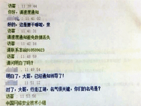 今年3月份深圳一珠宝网站客服,收到一条自称是黑客发来的信息,“我是黑客,准备攻击你们的网站,赶紧让你们负责人跟我联系……