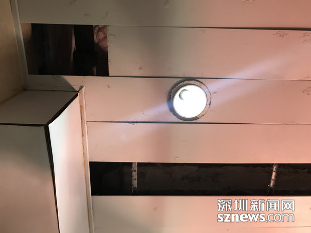 整个洗手间透着难闻的异味,卫生间正中的天花板上有一个处暗灰色的通风设备,但轴没有转动,显然并没有开启。在设备一旁的天花板却让人大吃一惊,记者看到墙面多处塌陷,已能肉眼清晰看到空隙里的铁锈管道和混泥土的墙体,一片昏暗。与之相对的地面,则是耀眼的红地毯,地毯中间的位置已经泛着黑色。