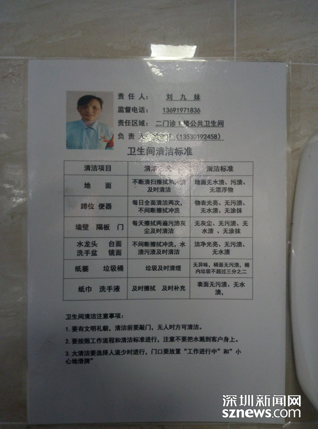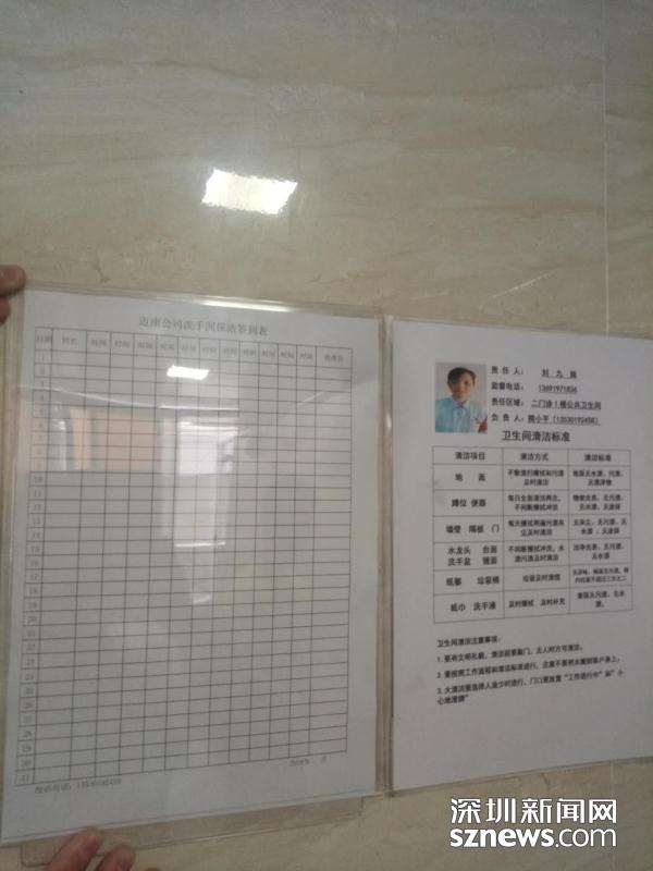 值得注意的是,针对公共卫生间人流量大、清洁消毒频次低、纸巾未及时清理等薄弱环节,深圳市第一人民医院在高峰时段在男女卫生间各增派一名专职保洁人员,清洁频次签到表已上墙,做到每半小时巡查一次并签到,对洗手台、镜面水渍和垃圾篓纸巾随见随清,加大了对卫生间的监管和巡场频率,同时把工作表现与每月质量奖考核挂钩,奖优罚劣。