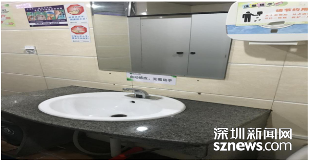 整改后,洗手间水龙头更换为感应式节水设备