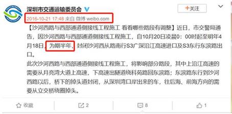 据市交委于2016年10月21日发布的通告称,沙河西路与西部通道侧接线工程(即东滨路隧道匝道工程)的施工时间计划为2016年10月20日凌晨0:00时起至2017年4月18日,为期半年。期间将封闭沙河西从路南行s3广深沿江高速进口及s3东行东滨路出口。