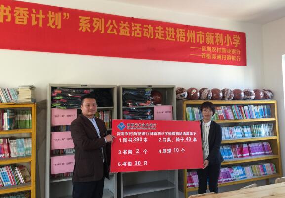 2017年,由深圳农商行发起的“信用卡公益计划·书香图书室”捐赠活动,深入走进广西壮族自治区的偏远山区,为当地较为贫困的扶典小学、新利小学、林旺小学和育才小学带来温暖和鼓励。本次活动共捐赠各类图书1899册、文体用品130套、书包590个、书桌书架椅子42套,有效地帮助这四所小学建设充实图书室,为孩子们创造良好的阅读环境,让更多孩子在阅读中滋养向上生长的力量。