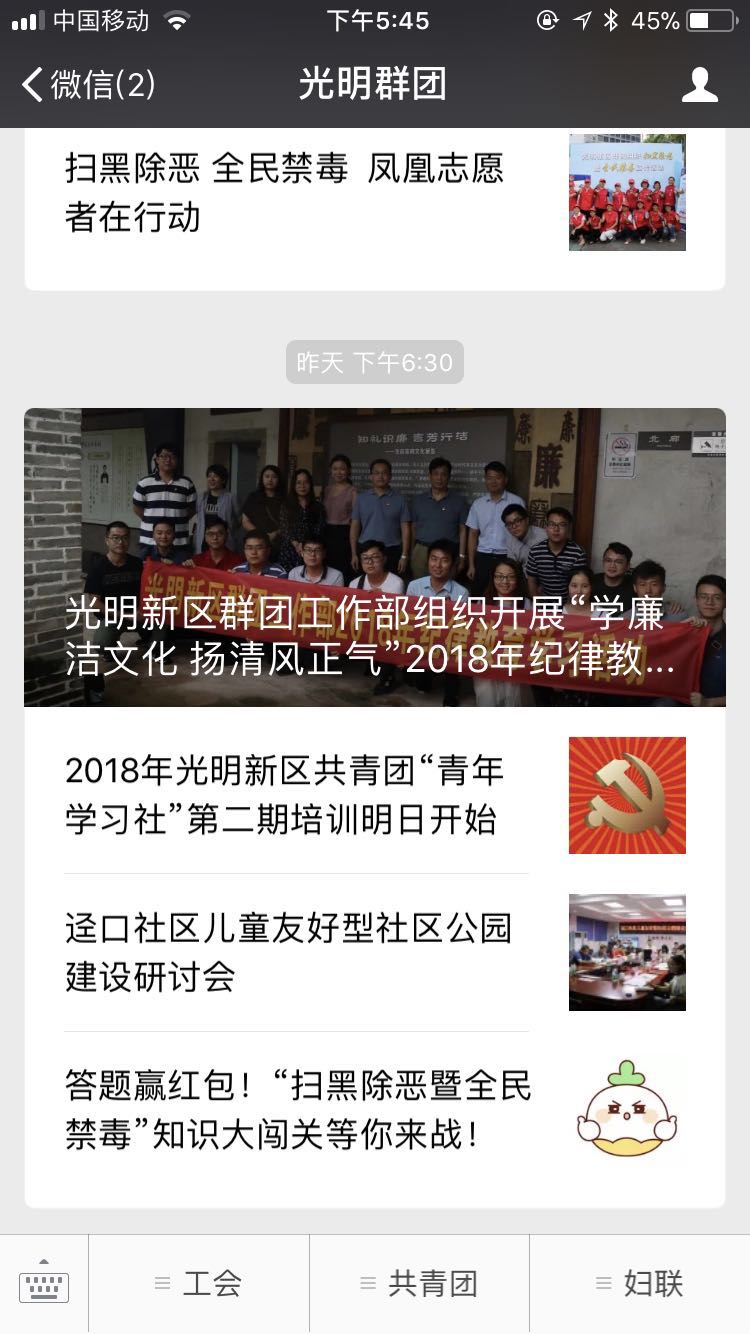 案例介绍:深圳市光明新区群团工作部公众账号,包括光明工会、光明团委、光明妇联,发布新闻资讯、提供便捷服务。