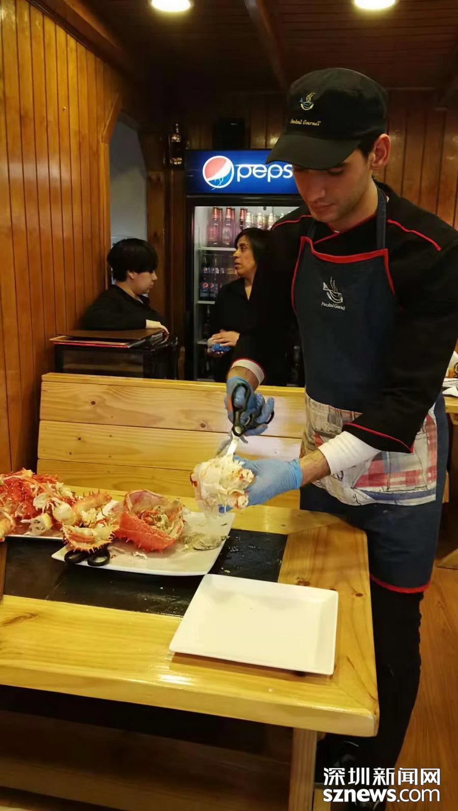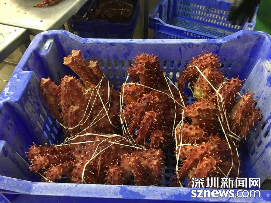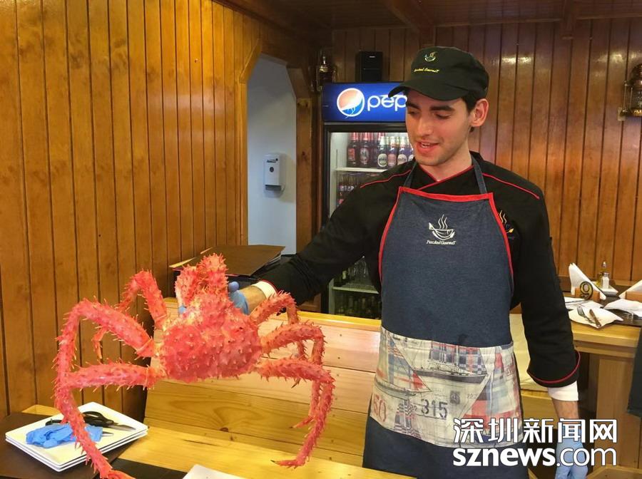 深圳新闻网讯 蜘蛛蟹(又名皇帝蟹)只产于南北两极冰冷的海洋中,因为八条腿特长,外观形似蜘蛛,而且触角也比普通螃蟹多,所以被称为蜘蛛蟹,大个的重量可达5公斤以上。智利政府规定,小于1.5公斤的不许捕捞。