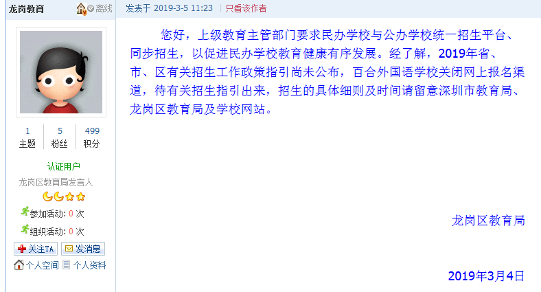 3月5日11时23分,龙岗区教育局官方账号发布回应网帖,回应称“上级教育主管部门要求民办学校与公办学校统一招生平台、同步招生,以促进民办学校教育健康有序发展。”“2019年省、市、区有关招生工作政策指引尚未公布,百合外国语学校关闭网上报名渠道,待有关招生指引出来,招生的具体细则及时间请留意深圳市教育局、龙岗区教育局及学校网站。”