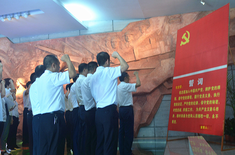 在宣誓展厅内,全体人员首先重温入党誓词,面对鲜艳的中国共产党党旗,大家肃穆站立,庄严的举起右手,在梁丹书记的领誓下一字一句宣读入党誓词,重温入党时的满腔激情和庄严承诺。