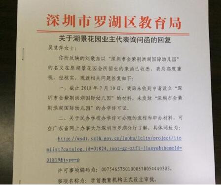 6月16日,市民在深圳论坛以《举报湖景花园会所开办幼儿早教班违法招生》为题发帖反映,罗湖区湖景花园第四届业主委员会于2018年7月曾去函罗湖区教育局,询问“深圳金紫荆洪湖国际幼儿园”是否具备招生资格。教育局明确回复:未收到该幼儿园的申请资料,也未发放该园的办学许可。