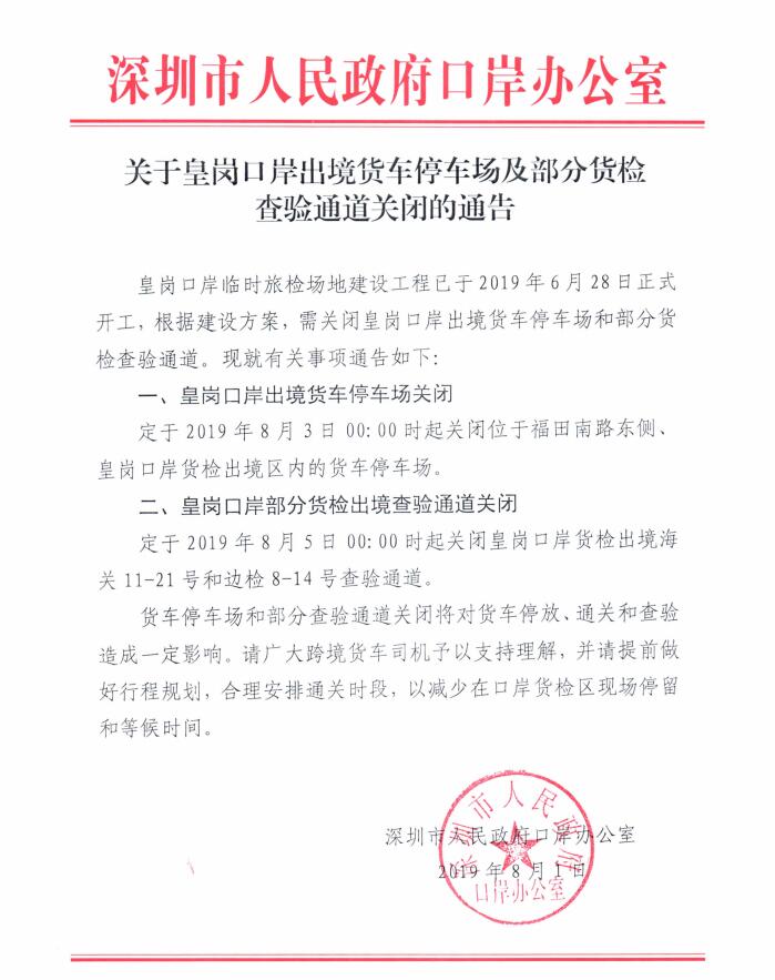 定于2019年8月5日00:00时起关闭皇岗口岸货检出境海关11-21号和边检8-14号查验通道。