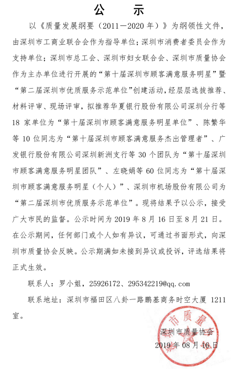 深圳新闻网2019年8月16日讯 8月16日,深圳市质量协会正式下发“第十届深圳市顾客满意服务明星”暨“第二届深圳市优质服务示范单位”拟推荐名单正式对外公布并进行公示,公示时间为2019年8月16日至2019年8月21日。