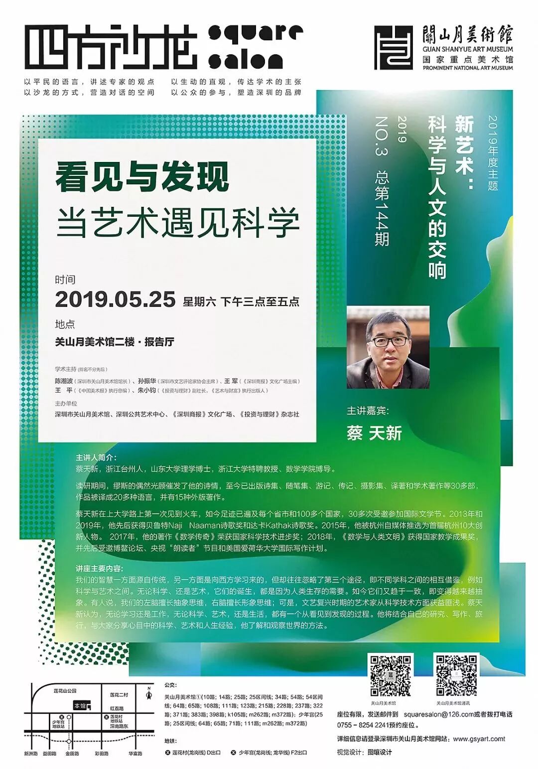 讲座主题:《看见与发现,当艺术遇见科学》 地点:关山月美术馆二楼报告厅 主讲人:蔡天新 时间:2019年5月25日(星期六下午3点至5点) 票价:免费免票 我们的智慧一方面源自传统,另一方面是向西方学习来的,但却往往忽略了第三个途径,即不同学科之间的相互借鉴,例如科学与艺术之间。无论科学、还是艺术,它们的诞生,都是因为人类生存的需要。如今它们又趋于一致,即变得越来越抽象。有人说,我们的左脑擅长抽象思维,右脑擅长形象思维;可是,文艺复兴时期的艺术家从科学技术方面获益匪浅。蔡天新认为,无论学习还是工作,无论科学、艺术,还是生活,都有一个从看见到发现的过程。他将结合自己的研究、写作、旅行,与大家分享心目中的科学、艺术和人生经验,他了解和观察世界的方法。 《红色的拖车》 蔡天新摄于西班牙 《小巷里的孩子》 蔡天新摄于杜尚别 《漓江》 蔡天新摄于桂林 蔡天新在上大学路上第一次见到火车,如今足迹已遍及每个省市和100多个国家,30多次受邀参加国际文学节。 《莱茵河的女骑手》 蔡天新摄于瑞士 《尼罗河》 蔡天新摄于苏丹 2013年和2019年,他先后获得贝鲁特Naji Naaman诗歌奖和达卡Kathak诗歌奖。2015年,他被杭州自媒体推选为首届杭州10大创新人物。 《年轻的母亲》 蔡天新摄于贝宁 2018年夏天,蔡天新做客央视“朗读者”。 2017年,他的著作《数学传奇》荣获国家科学技术进步奖;2018年,《数学与人类文明》获得国家教学成果奖,并先后受邀博鳌论坛、央视“朗读者”节目和美国爱荷华大学国际写作计划。 蔡天新著作 蔡天新,曾是少年大学生,山东大学理学博士,浙江大学数学学院教授、博士生导师,求是特聘教授。 读研期间,缪斯的偶然光顾催发了他的诗情,至今已出版诗集、随笔集、游记、传记、摄影集、译著和学术著作等30多部,作品被译成20多种语言,并有15种外版著作。 关山月美术馆欢迎您! 地址:深圳市福田区红荔路6026号 开放时间:9:00—17:00(逢周一休馆) 电话:0755—83063086 本项目由深圳市宣传文化事业发展专项基金资助,欢迎各位市民参与、监督并评价,您的意见和建议有助于项目的改进和提升。