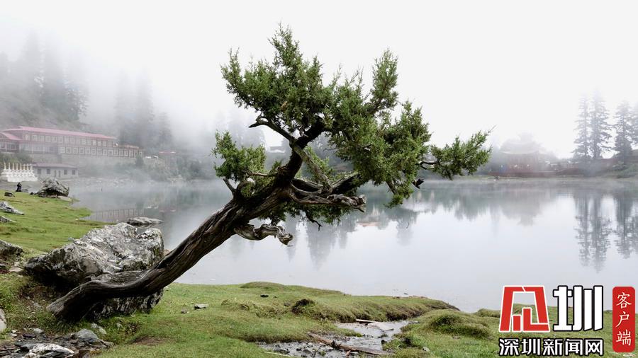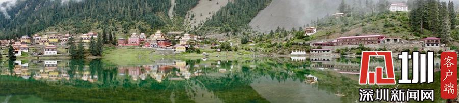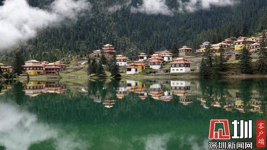 湖的四周是森林和由措卡寺寺僧主持修建的藏传佛教各色建筑,它们时而云遮雾障,时而与蓝天白云一起倒映在湖中。李仁奇摄