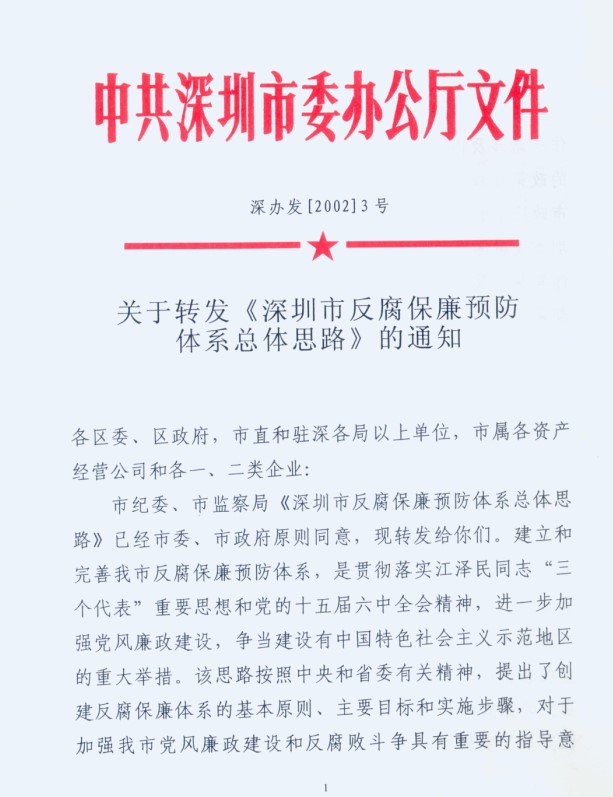 2002年,深圳提出了“反腐保廉预防体系总体思路”,构建党员干部“不想贪、不能贪、不敢贪”的惩防腐败体系。同年深圳市纪委被中央纪委评为“全国纪检监察系统先进集体”,被广东省纪委评为“全省纪检监察系统先进集体”,被中央精神文明建设委员会评为“全国精神文明创建工作先进单位”。