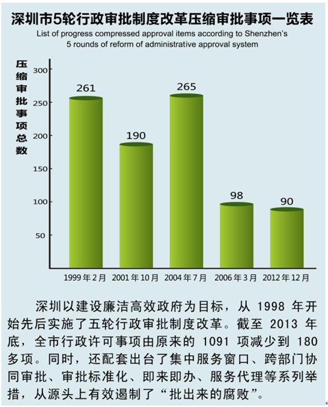 以建设廉洁高效政府为目标,深圳从1998年开始先后实施了五轮行政审批制度改革,全市行政许可事项由原来的1091项减少到2013年底的209项。与此同时推行了集中服务窗口、跨部门协同审批、审批标准化、即来即办、服务代理等一系列便民、促廉举措,有效遏制 “批出来的腐败”。