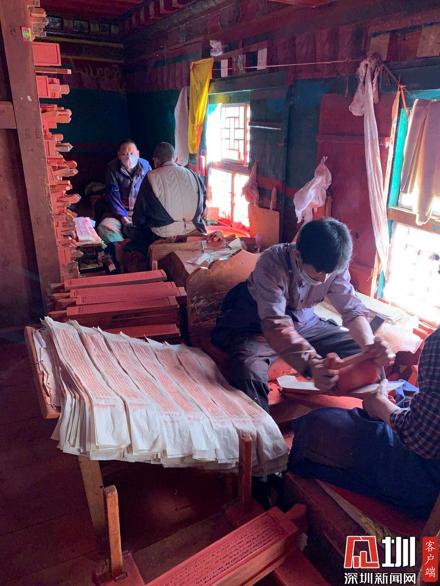 上述工序既是流水作业,又相互交叉,有条不紊。印刷是整个生产工艺流程中工人负荷较重、工序相对较多的关键部分,主要在印经院的二楼。印刷工由两人一组,一高一矮相对而坐,印版就放置在两人之间的斜板上。李仁奇摄