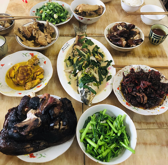 大年三十的团圆饭,很多地方因为晚上吃,所以叫做“年夜饭”,而在我们县城,则是中午吃团圆饭。团圆饭就是后辈围着家族中最大的长辈团聚过年,那是一年中最丰盛的一顿饭,团圆饭的主菜一定有肉、鱼和鸡鸭,因为这些农家都可以自给自足。大家围在桌上团团圆圆,共叙亲情,