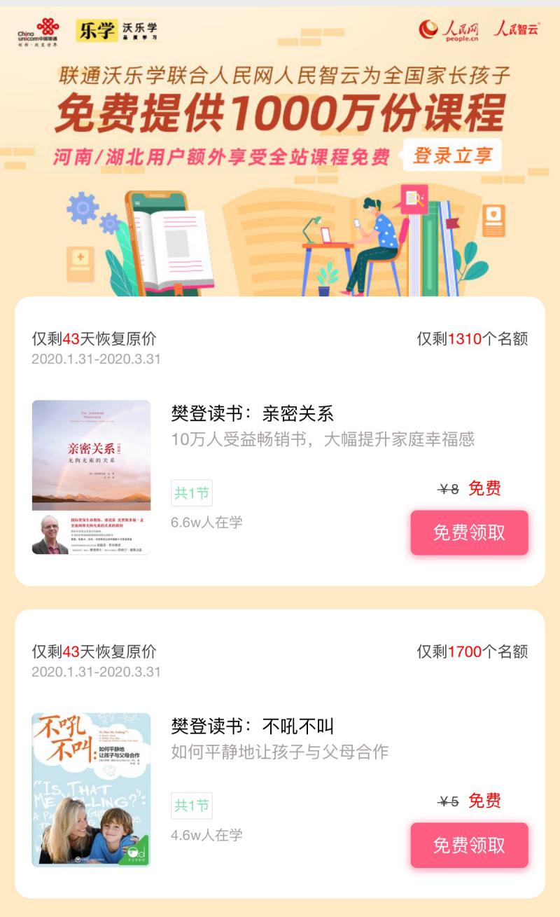 受疫情影响,学校开学时间延迟,广大学子只能在家中网上听课。为响应教育主管部门“停课不停学”的号召,深圳联通携手合作伙伴为深圳用户提供1000万份免费精品课程,即日起至3月31日,深圳联通用户通过“沃乐学”APP、“沃乐学课堂”微信公众号,进入首页即可免费领取指定精品课,满足广大家长和学生的实际需求,让广大学子做到防疫、学习两不误。