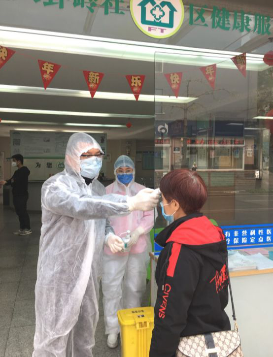 ▲图为福田区纪委监委干部在园岭街道八卦岭社康中心抽查就诊的居民测试体温情况。(福田区纪委监委易玮群/摄)