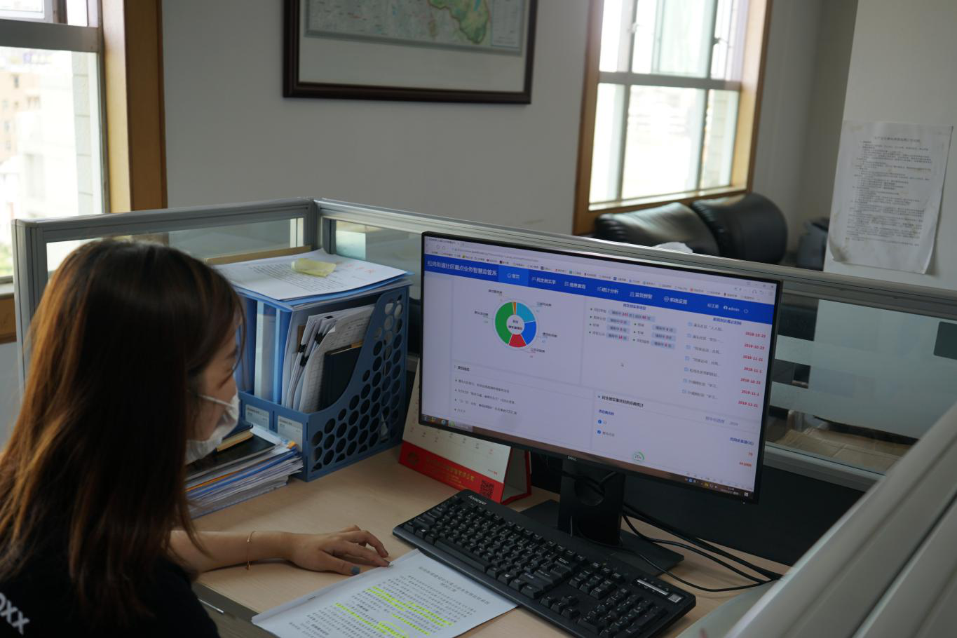 松岗街道纪工委工作人员利用社区重点业务智慧监管系统监督民生微实事项目进展情况。(松岗街道纪工委杜发超 摄)