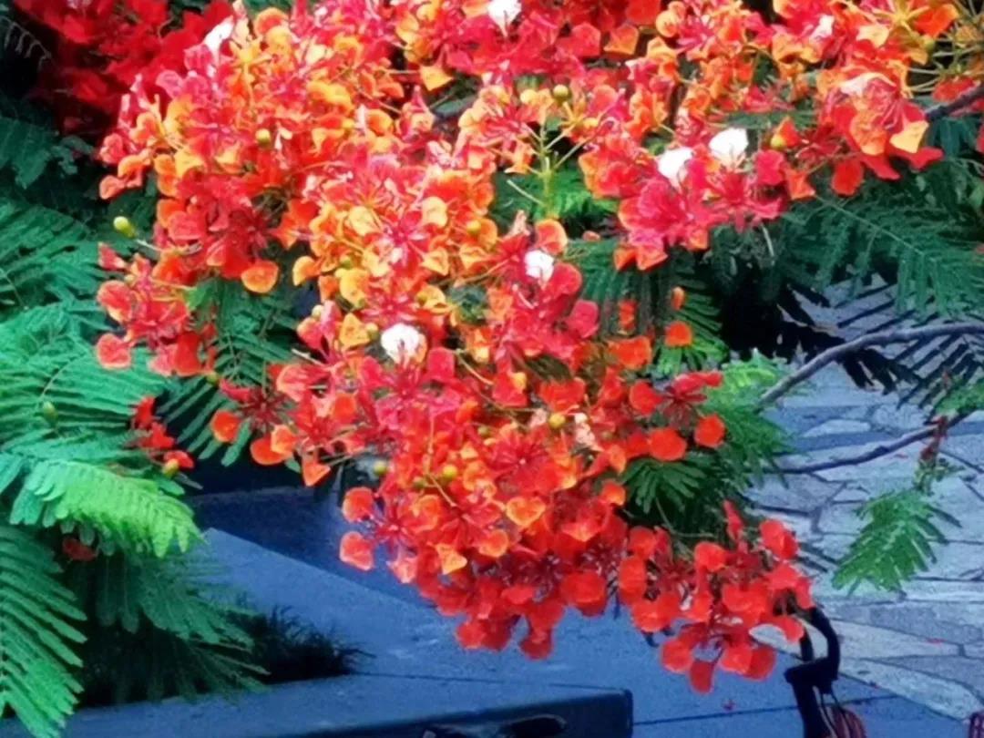 之前在阳台上看凤凰树,是全家人开心无比的事。无论白天、夜晚还是深夜,凤凰树犹如一位好友,默默相伴。特别是周末清晨,鸟儿在枝头玩耍跳跃,呼朋唤友,那欢快场景、清脆叫声,使人想起民乐名篇中的《画眉跳架》,听之欢欣不已。每年五至八月花季时,蜜蜂也来凑热闹,在云霞般的花海里出没,宛如鱼跃龙门,又像哪吒闹海。