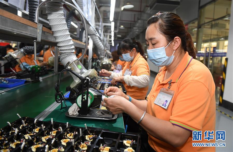 5月9日,广西东兰龙华高科技产业园一家企业的员工在生产线上作业。新华社记者陆波岸摄