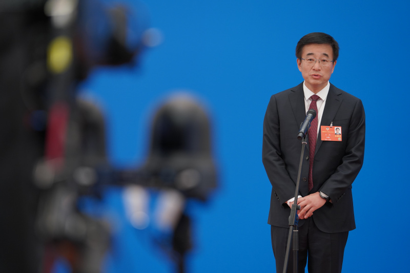 5月21日,在北京人民大会堂新闻发布厅举行的全国政协十三届三次会议第一场“委员通道”采访活动上,全国政协委员王辰通过网络视频方式接受媒体采访。新华社记者刘金海摄