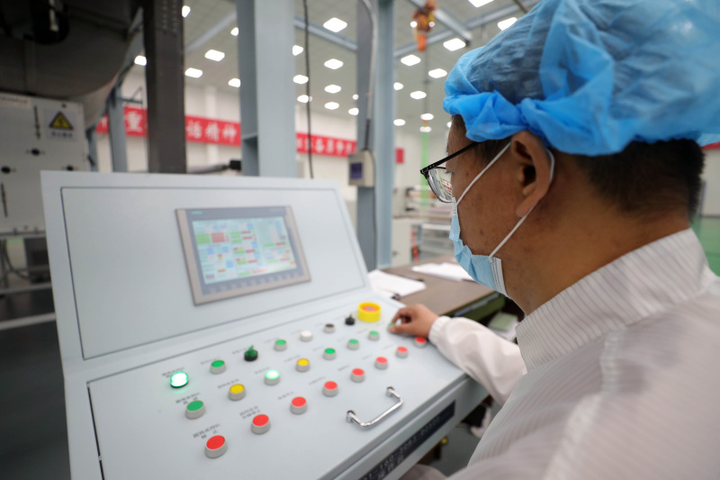 4月20日,工人在中国石油辽阳石化公司聚酯厂熔喷无纺布车间生产线上忙碌。新华社记者杨青摄