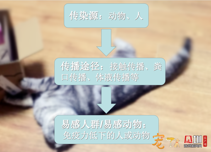一般来说,人宠共患病可以分为3个基本环节:传染源、传播途径及易感人群(或易感动物)。
