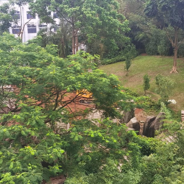 其次,从今年7月起,在二层架高平台之上的山坡绿地,存在树木砍伐和绿地草坪遭毁坏的情况,且有挖掘机开入并停泊,而现场也没有任何工程信息和告示。