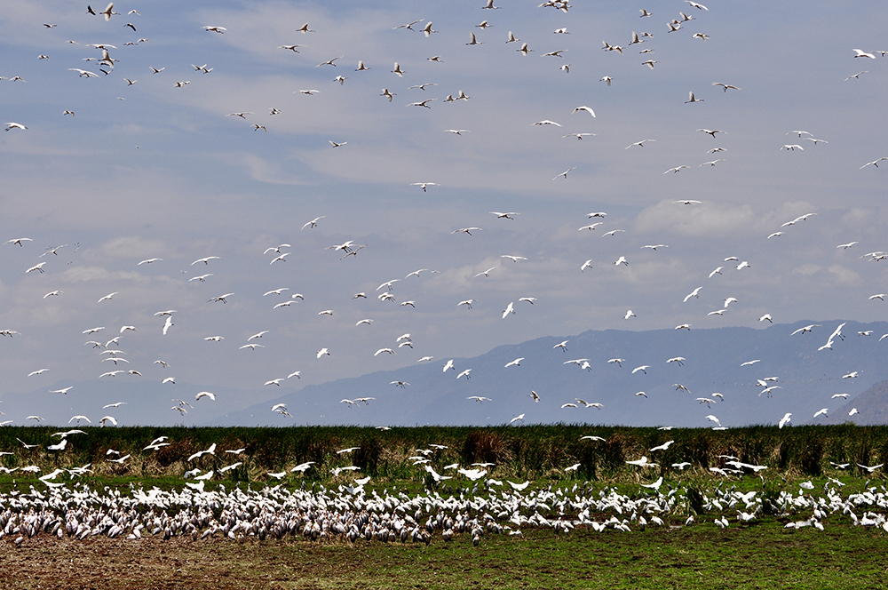 每年不同时期,红鹤、鹈鹕、鸬鹚、火烈鸟等大型鸟类云集湖区,绵延数公里,十分壮观。李仁奇 摄