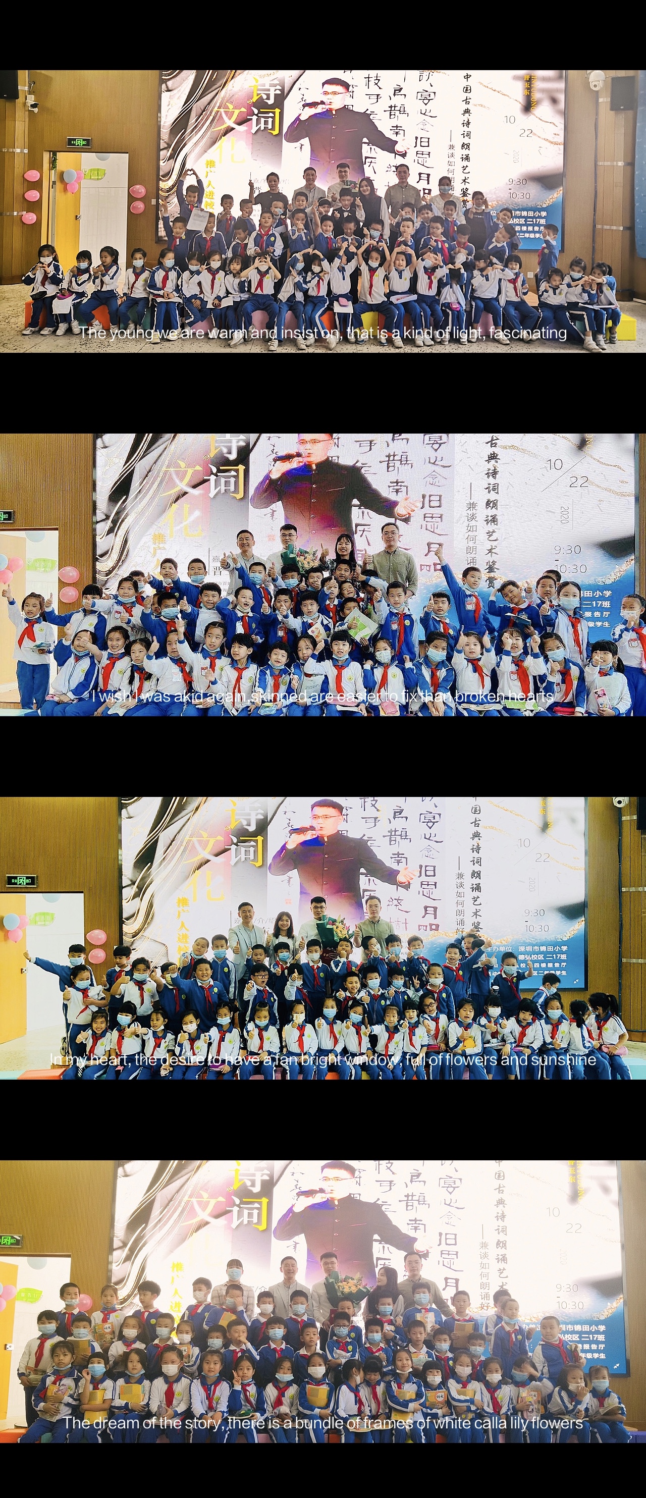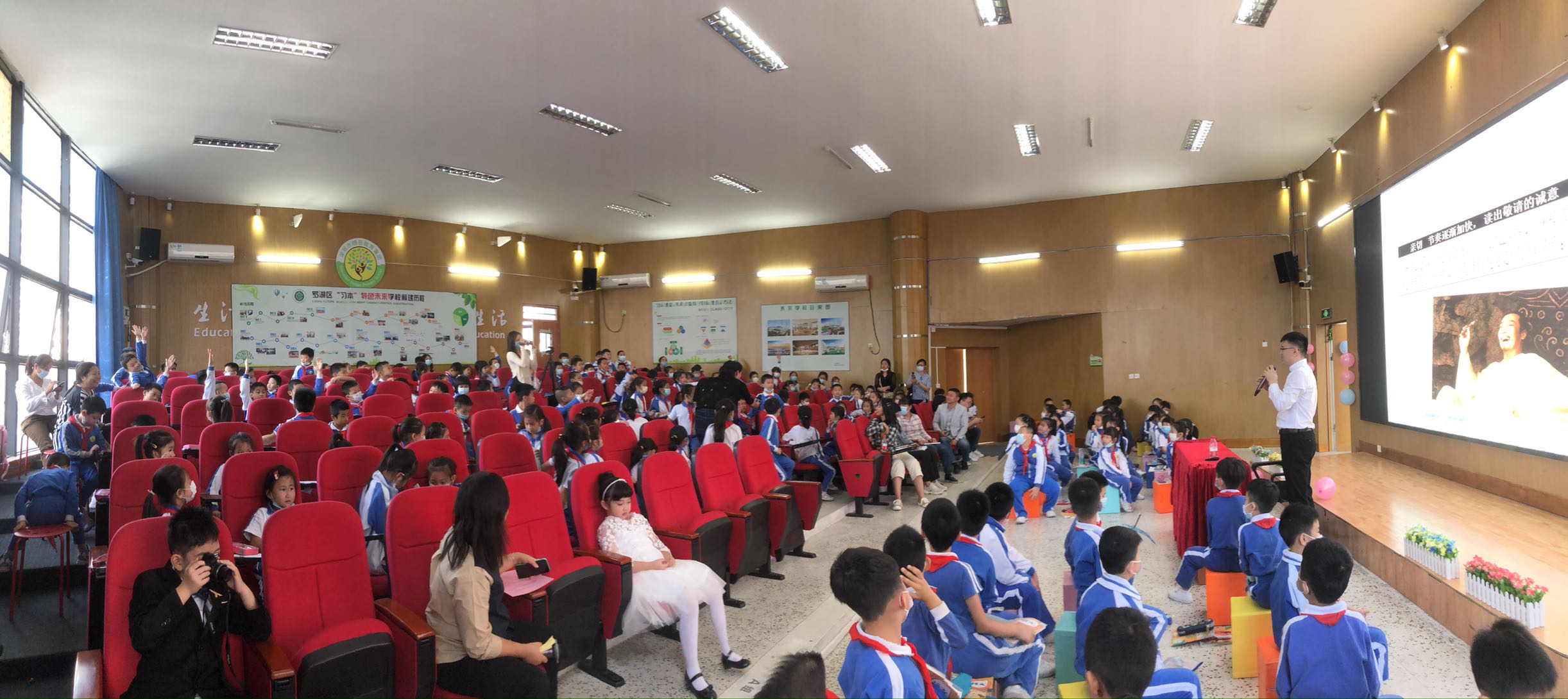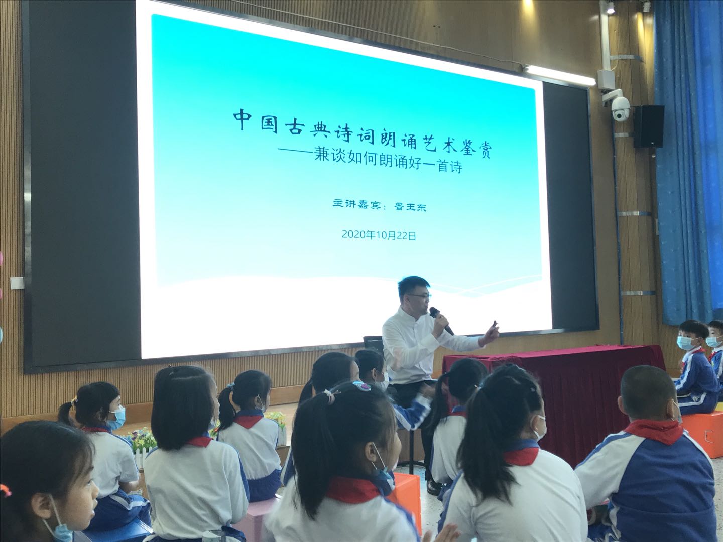 习近平总书记在深圳经济特区建立40周年庆祝大会上指出,中国特色社会主义是物质文明和精神文明全面发展的社会主义,经济特区要坚持“两手抓、两手都要硬”,要教育引导广大干部群众特别是青少年坚定中国特色社会主义道路自信、理论自信、制度自信、文化自信。文化兴则教育兴,文化强则教育强。为进一步弘扬中华优秀传统文化,近日,深圳市锦田小学特邀青年文化学者、深圳市百姓学习之星、深圳市公益阅读推广人、深圳市首届家园文化文学会会长晋玉东为广大师生开展了一场别开生面的“中国古典诗词朗诵艺术鉴赏——兼谈如何朗诵好一首诗”公益文化讲座。罗湖区锦田小学德弘校区刘向阳副校长、罗湖区锦田小学德弘校区张俊晖主任、罗湖区未来学校谢淑红主任全程与会以及德弘二年级家委代表、语文科组老师参加,活动由班主任梁文雅和学生刘沛东、张家琪共同主持,近200名师生参加了讲座活动。整场讲座师生热情高涨,主讲嘉宾晋玉东深入浅出、娓娓道来,参与学生思维活跃、表现积极,带动校园形成了学习诗词文化的良好氛围。