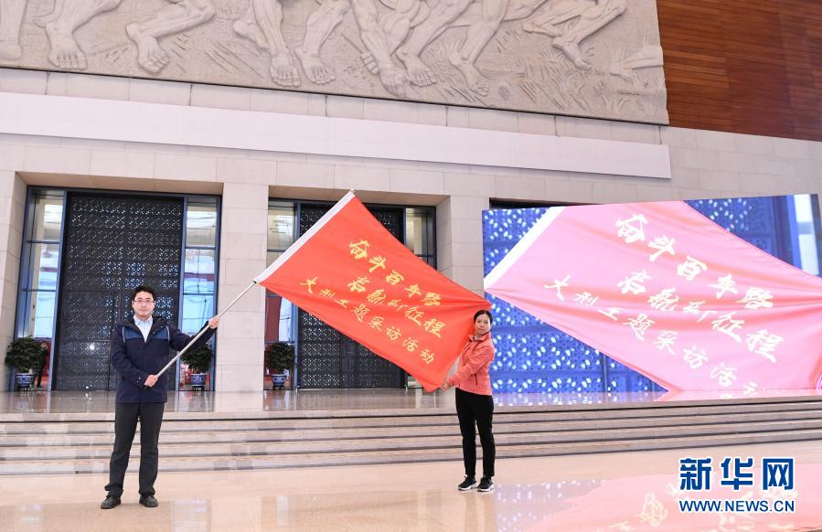 1月18日,在北京国家博物馆,记者代表展示“奋斗百年路启航新征程”大型主题采访活动旗帜。新华社记者申宏摄